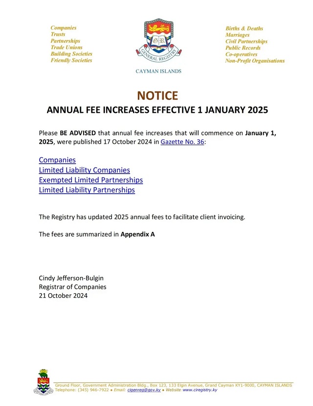 重要通知 | 開曼群島公司、有限責(zé)任公司和合伙企業(yè)年費將于2025年1月1日起上調(diào)