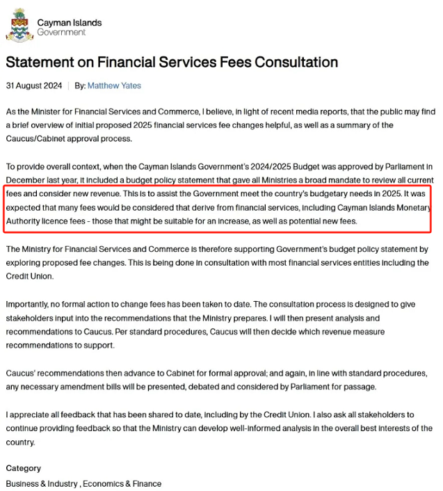 開曼群島政府近日發(fā)布咨詢文件,建議于2025年1月1日起調(diào)高所有開曼群島公司的政府牌照費用。關(guān)于費用調(diào)整的原因,開曼群島金融服務(wù)部的解釋中提到:“為了幫助政府滿足2025年的預(yù)算需求,將通過探索擬議費用變更來支持政府的預(yù)算政策聲明,許多來自金融服務(wù)的費用將被考慮,包括開曼群島金融管理局的許可費,可能適當(dāng)增加的費用,以及潛在的新費用。因此,將對開曼群島公司年費費用進(jìn)行調(diào)整,以彌補(bǔ)增加的服務(wù)交付成本?!?/p>