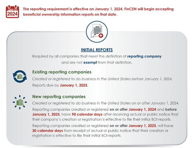 FinCEN的這一要求于2024年1月1日生效,除非屬于豁免情形或不適用情形,今年在美國新設(shè)或登記經(jīng)營的企業(yè)需要在90日內(nèi)向FinCEN提交BOI報(bào)告,今年之前已經(jīng)在美存續(xù)或登記經(jīng)營的企業(yè)需要在2025年1月1日前向FinCEN提交BOI報(bào)告。