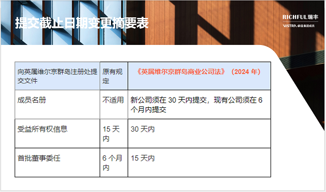 注冊代理人須在提交前核實信息,并在 30 天內(nèi)及時更新任何變更。在修訂法生效日期前成立的英屬維爾京群島實體,須在六個月內(nèi)遵守上述規(guī)定。