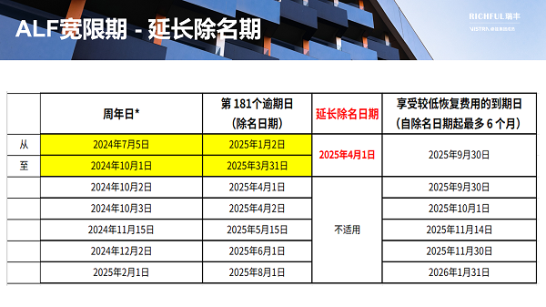 *如果周年日期是周末或公共假期,FSA將在隨后的下一個工作日接受 ALF 申請,不會受到任何處罰,但這不會改變除名日期的計算或較低的恢復費用期限。