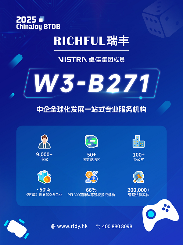 ChinaJoy作為中國乃至全球數(shù)字娛樂產(chǎn)業(yè)的風(fēng)向標(biāo),是連接國內(nèi)外游戲企業(yè)、探索合作機(jī)遇的頂級平臺。RICHFUL瑞豐深刻理解中國游戲企業(yè)在“走出去”過程中面臨的合規(guī)、財稅、運營、架構(gòu)搭建等復(fù)雜挑戰(zhàn)。我們參展ChinaJoy BTOB,正是為了深度參與這場游戲盛會,與優(yōu)秀的中國游戲開發(fā)者、發(fā)行商、平臺方和投資機(jī)構(gòu)面對面交流,分享我們在支持企業(yè)全球化方面的專業(yè)經(jīng)驗,特別是針對游戲出海的關(guān)鍵環(huán)節(jié)。