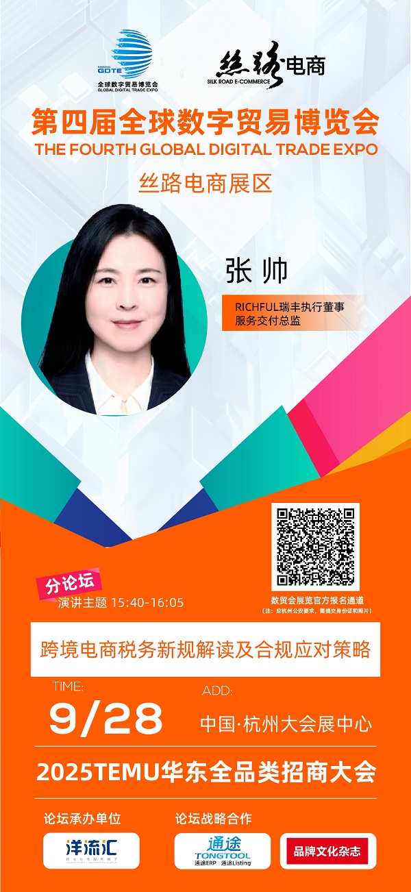 展會期間(9月28日),RICHFUL瑞豐執行董事、服務交付總監張帥女士將出席2025TEMU華東全品類招商大會,發表《電商新規解讀及跨境電商稅務全球稅務考量》重磅演講。屆時將權威解讀2025年15號、17號公告最新政策,深入剖析四大合規模式的適用場景與落地策略,幫助企業應對全鏈條穿透式監管新挑戰。